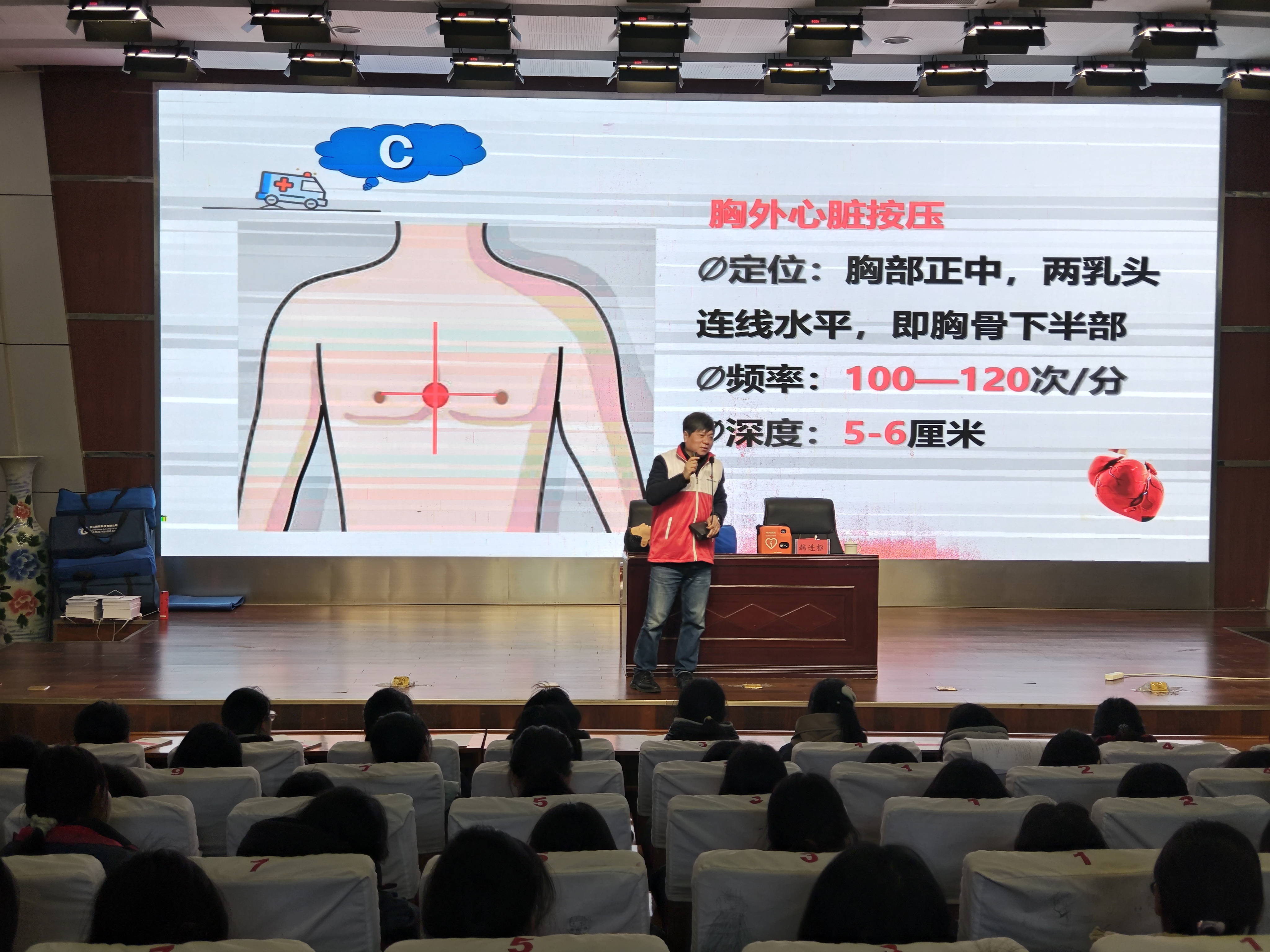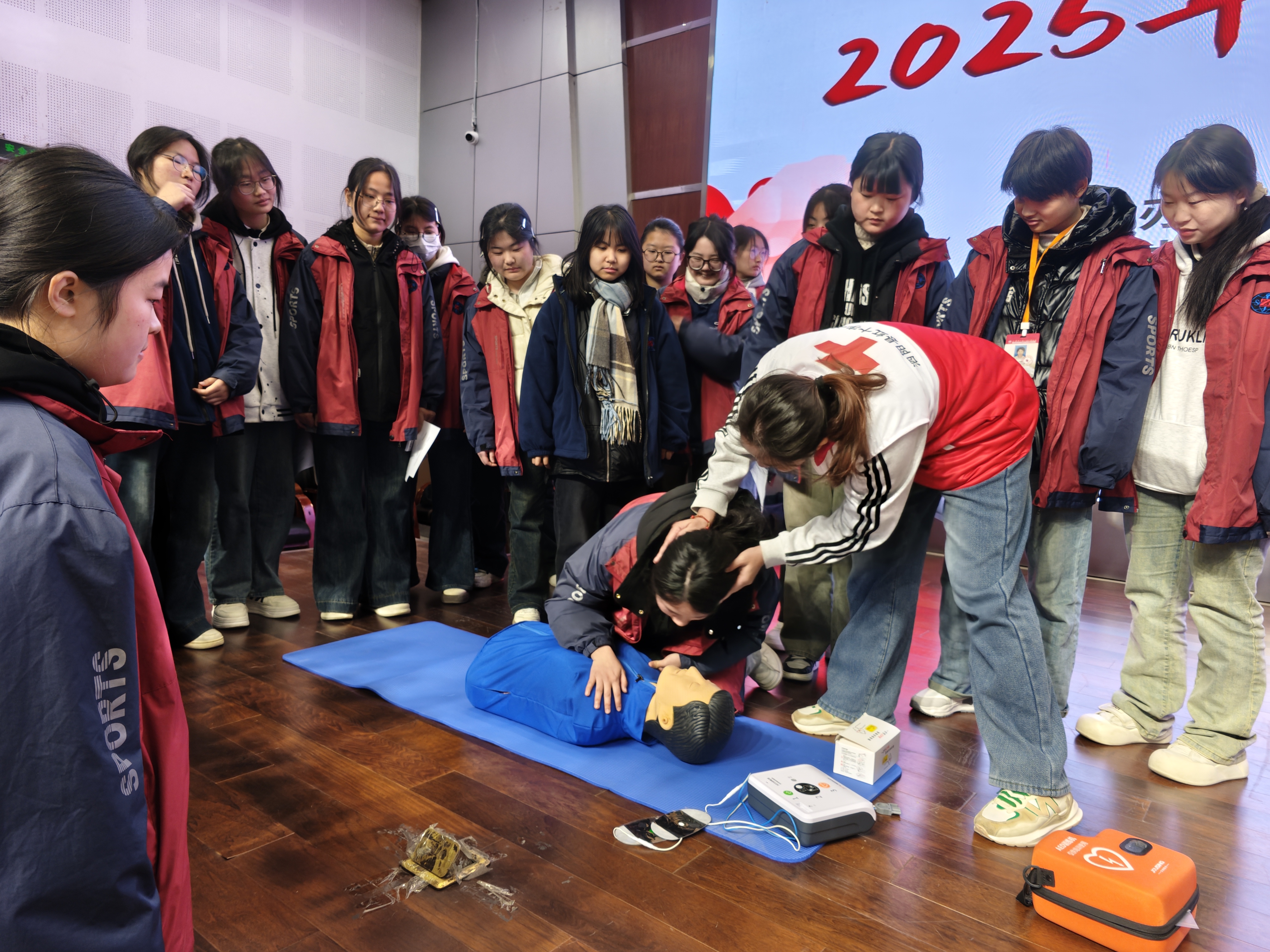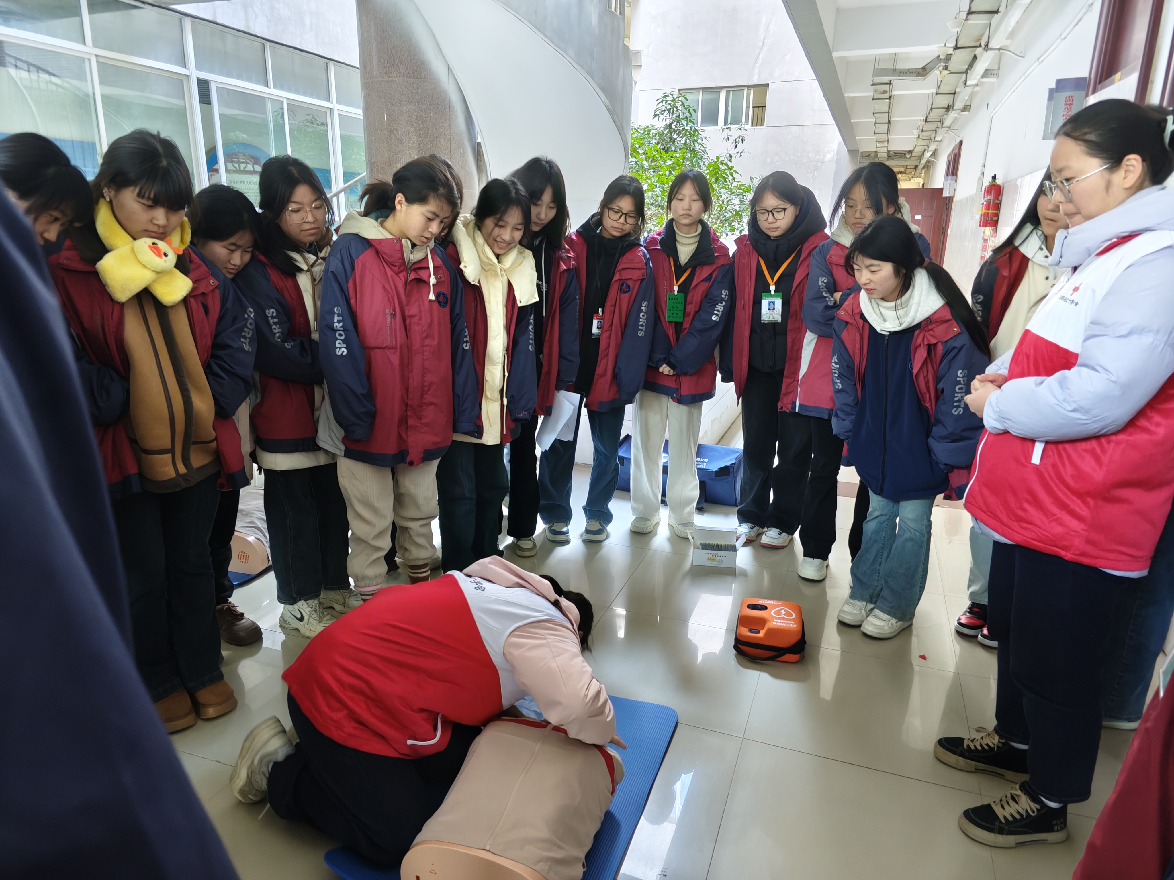 培训以讲授理论知识与实操演练相结合的方式展开。讲师通过日常校园生活和工作实践场景等,用生动形象的语言对心肺复苏术、AED使用、气道异物梗阻等急救知识进行了细致讲解,并通过模拟人向参训学员直观呈现了完整、规范的急救操作流程。