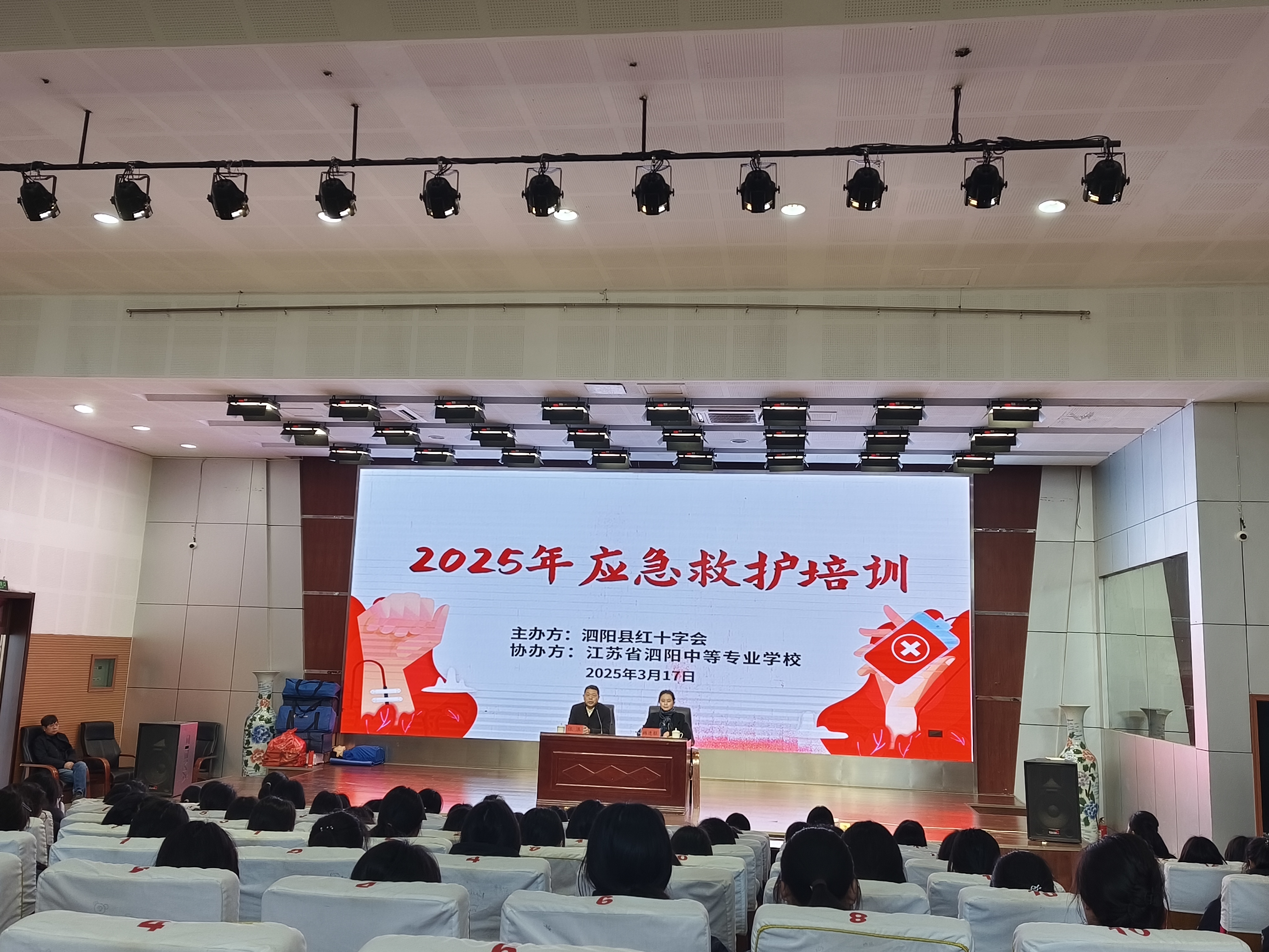 317日,泗阳县2025年应急救护培训班开班仪式在江苏省泗阳中等专业学校报告厅举行。县红十字会党组成员、副会长张浪中等专业学校副校长韩进枢应急救护培训讲师王怀建等参加。
