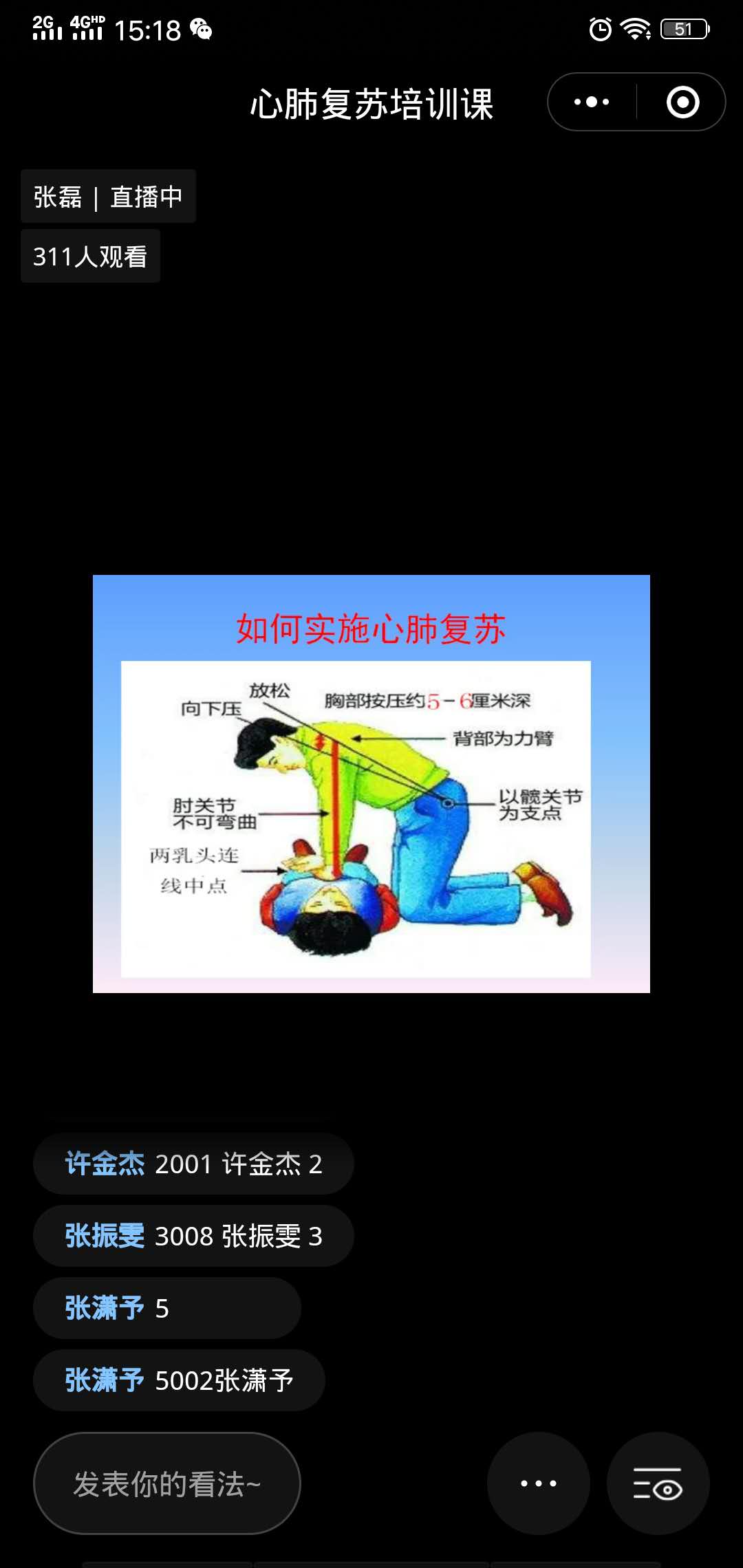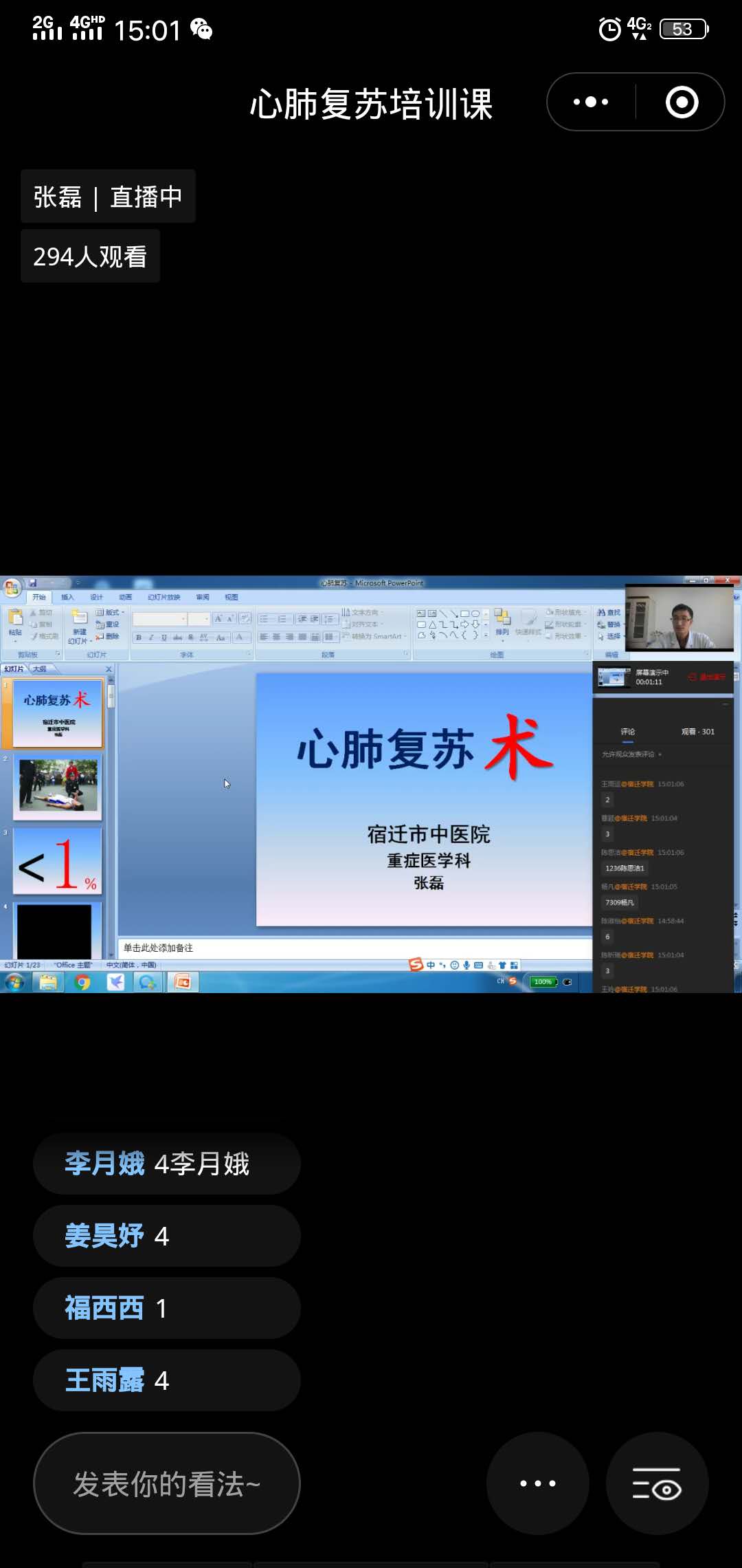 在网络直播讲座中,江苏省红十字会应急救护培训师、宿迁市中医院ICU室张磊医师用通俗易懂的语言对心肺复苏理论进行了简要的概述,重点对现场心肺复苏术的三个步骤,即打开气道、人工呼吸和胸外心脏按压进行讲解。张老师采用PPT演示,图文并茂的向同学们详细讲解了发现患者、做好自身防护安全、判断患者意识和呼吸、寻求帮助、呼救、观察患者体位,以及胸外按压、开放气道、人工呼吸等急救流程。