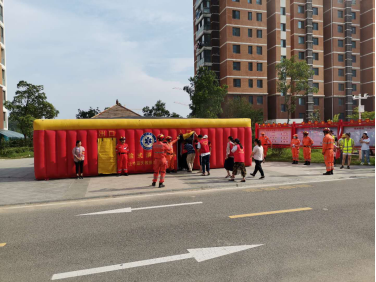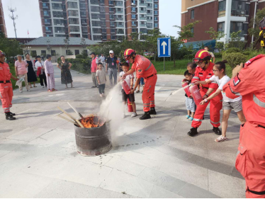 随后,在演习过程中,演练小组指导社区居民进行了灭火器灭火、水枪灭火的实际操作,并组织大家在逃生屋模拟了遇到火灾如何现场逃生。