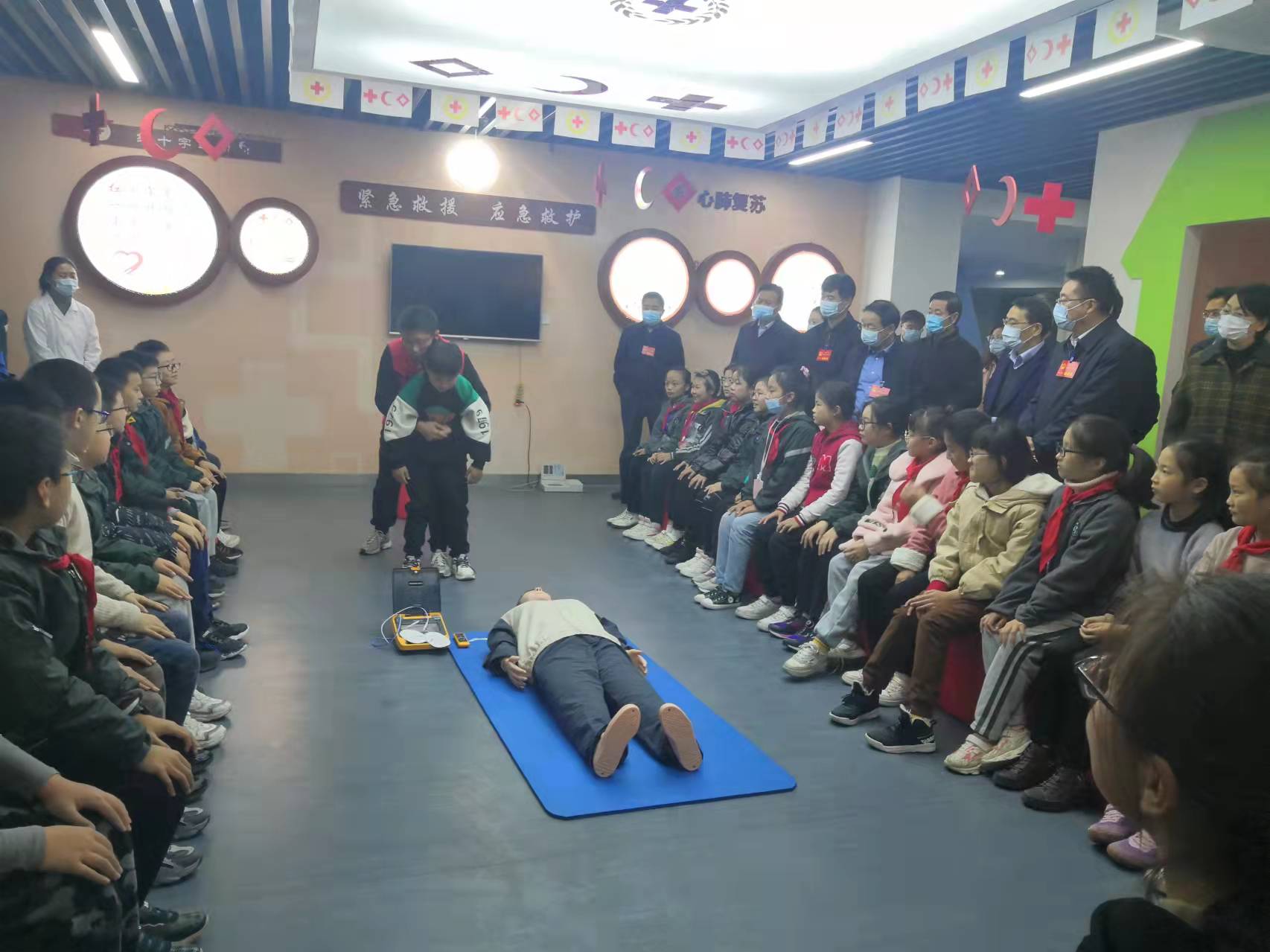 何通一行来到我区红十字学校庐山路小学,听取了学校关于应急救护现场汇报,实地查看了红十字医务室和AED急救站点,并参观了学校红十字生命安全体验馆,现场观摩了应急救护培训师开展的海姆立克急救和AED训练机的演示。